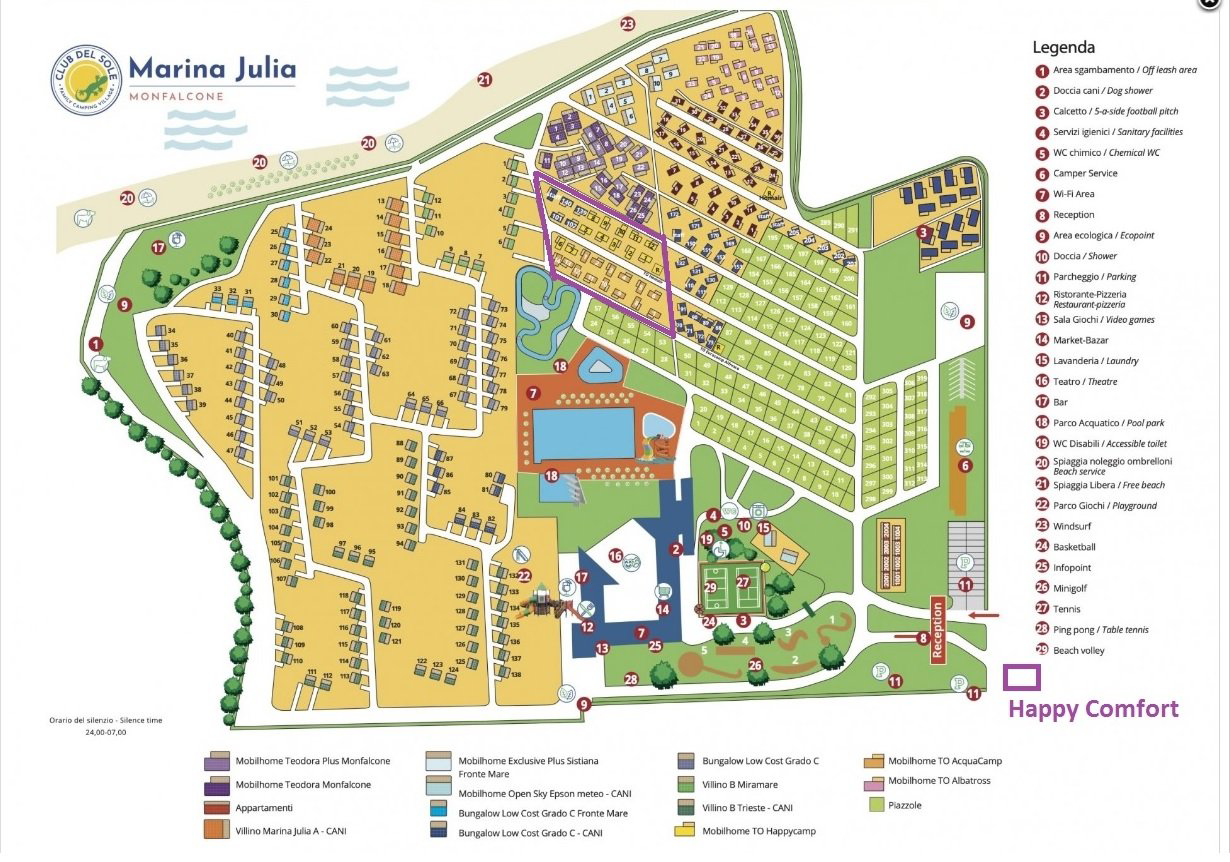 Located at the Gulf of Triëst, you will find the peaceful family campsite Marina Julia. The campsite has its own gently sloping sandy beach, providing enough variety between a day at the beach or at the swimming pool. With five swimming pools, spray park and a springboard, every type of swimmer will find something. With the boarder of Slovenia and the city of Trieste nearby, there is always something to visit. The sports enthusiasts can fully enjoy themselves on the kite or one of the sports fields. In short: a quiet but friendly campsite for young and old!